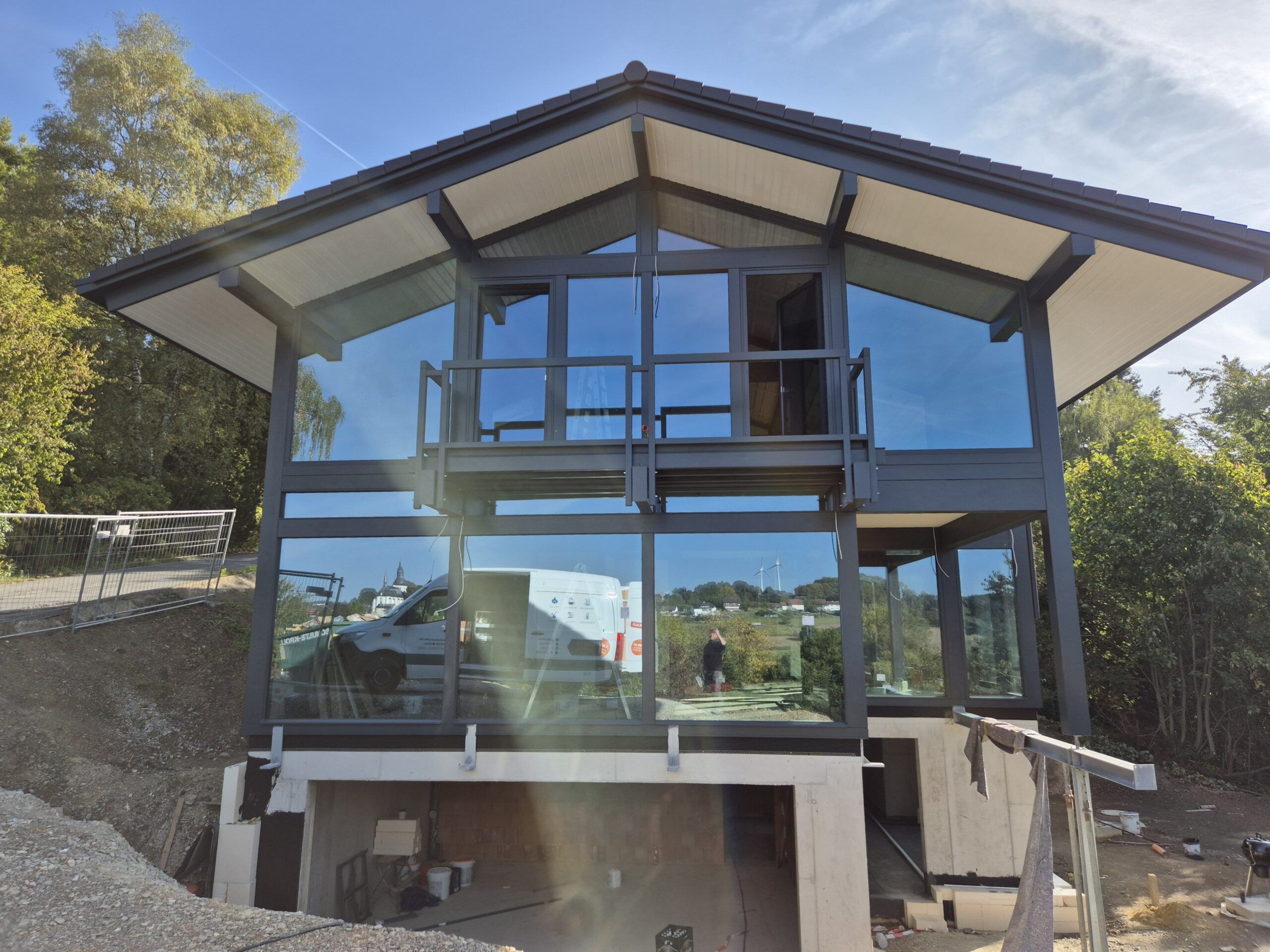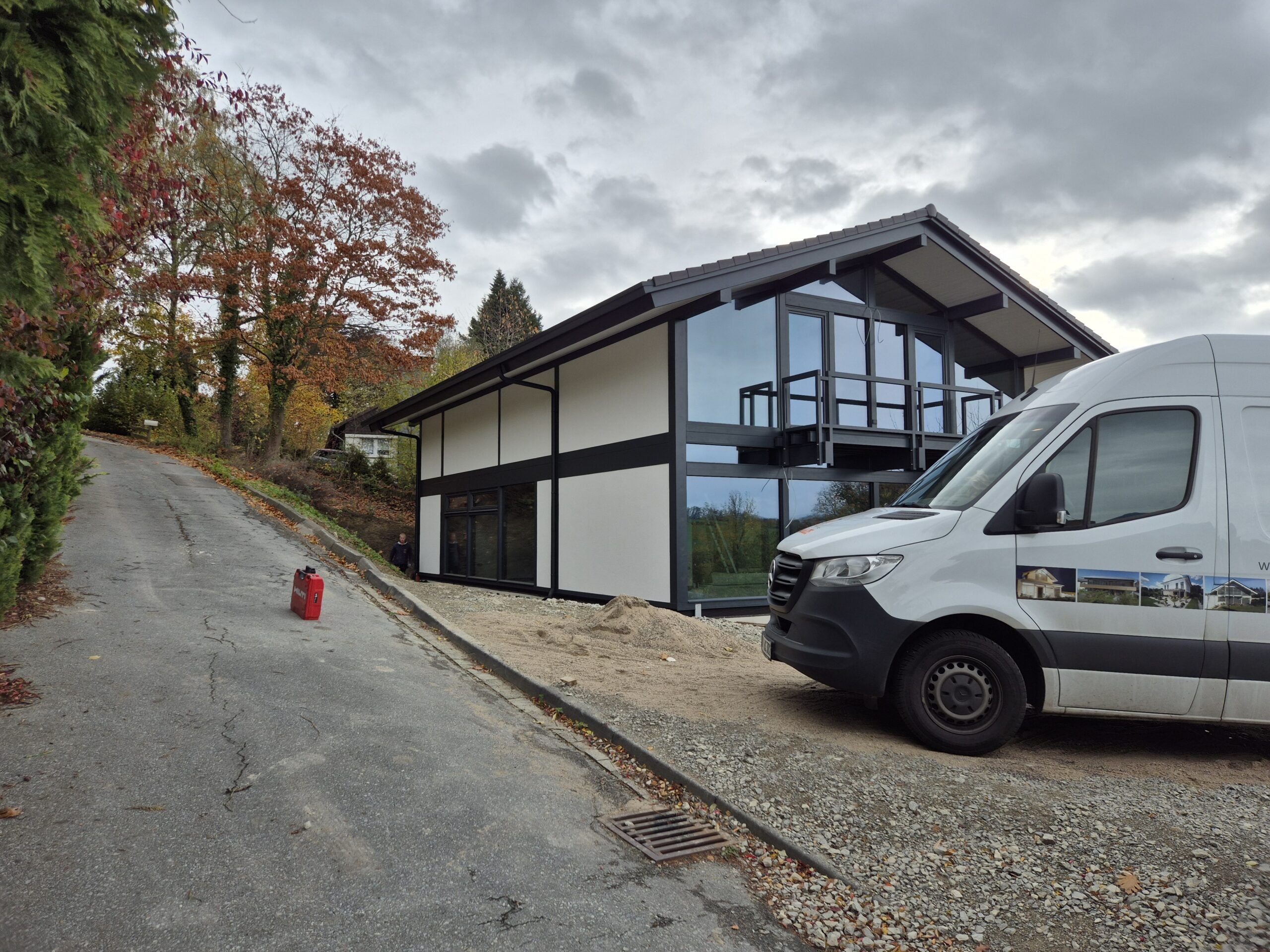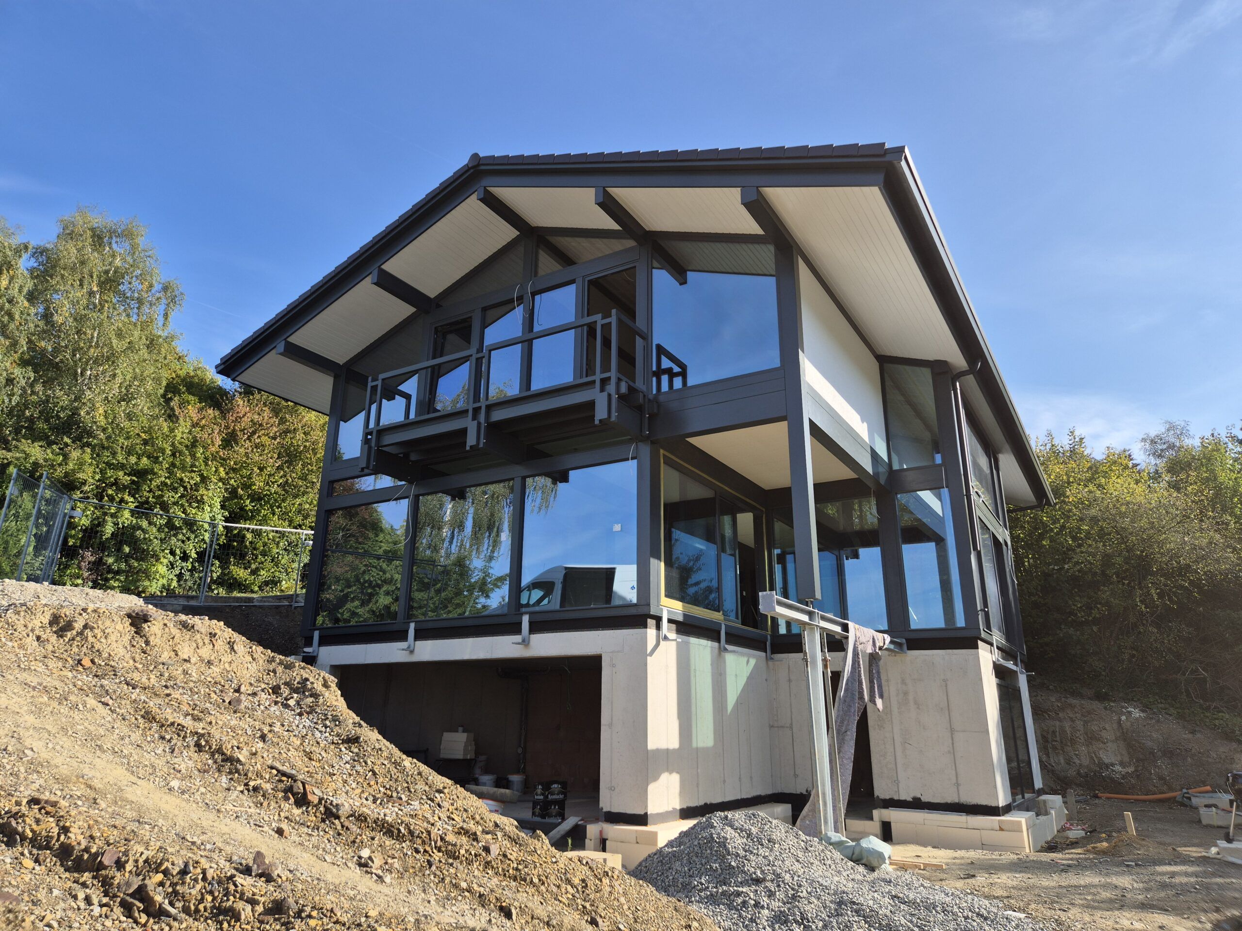 Im Kreis Soest entsteht ein modernes Fachwerkhaus, das Tradition und zeitgemäße Architektur auf besondere Weise vereint. Die markante Konstruktion in elegantem Anthrazit setzt klare Akzente und verleiht dem Gebäude eine stilvolle, zeitlose Optik.